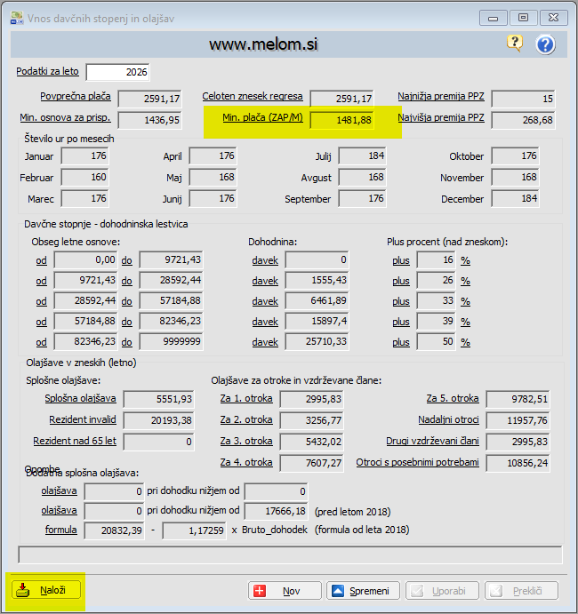 Podatek pred obračunom plače za januar 2026 popravite  v Tabele -> Davčne stopnje in olajšave  oz. ga naložite s klikom na Naloži!